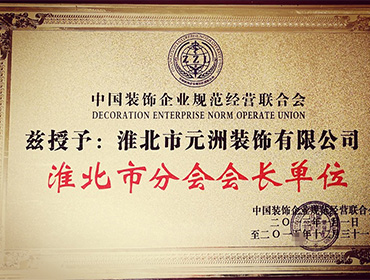 中國裝飾企業(yè)規(guī)范經(jīng)營聯(lián)合會茲授予“淮北市分會會長單位”